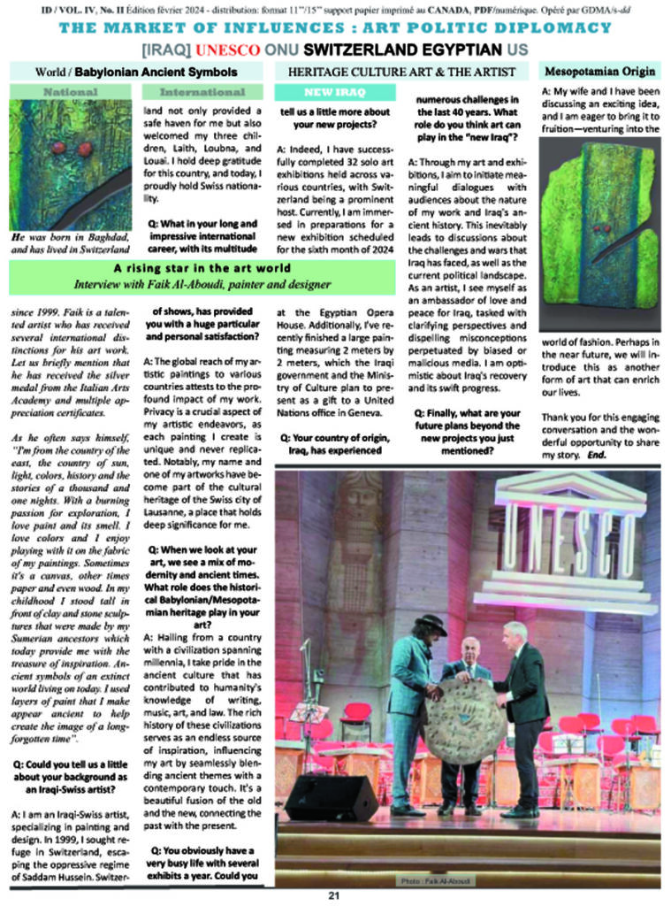 A: I am an Iraqi-Swiss artist, specializing in painting and design. In 1999, I sought refuge in Switzerland, escaping the oppressive regime of Saddam Hussein. Switzerland not only provided a safe haven for me but also welcomed my three children, Laith, Loubna, and Louai. I hold deep gratitude for this country, and today, I proudly hold Swiss nationality.