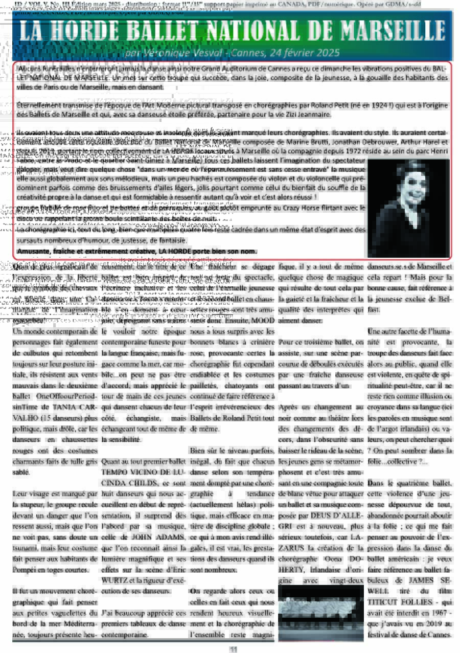 Éternellement transmise de l’époque de l’Art Moderne pictural transposé en chorégraphies par Roland Petit (né en 1924 !) qui est à l’origine des Ballets de Marseille et qui, avec sa danseuse étoile préférée, partenaire pour la vie Zizi Jeanmaire.