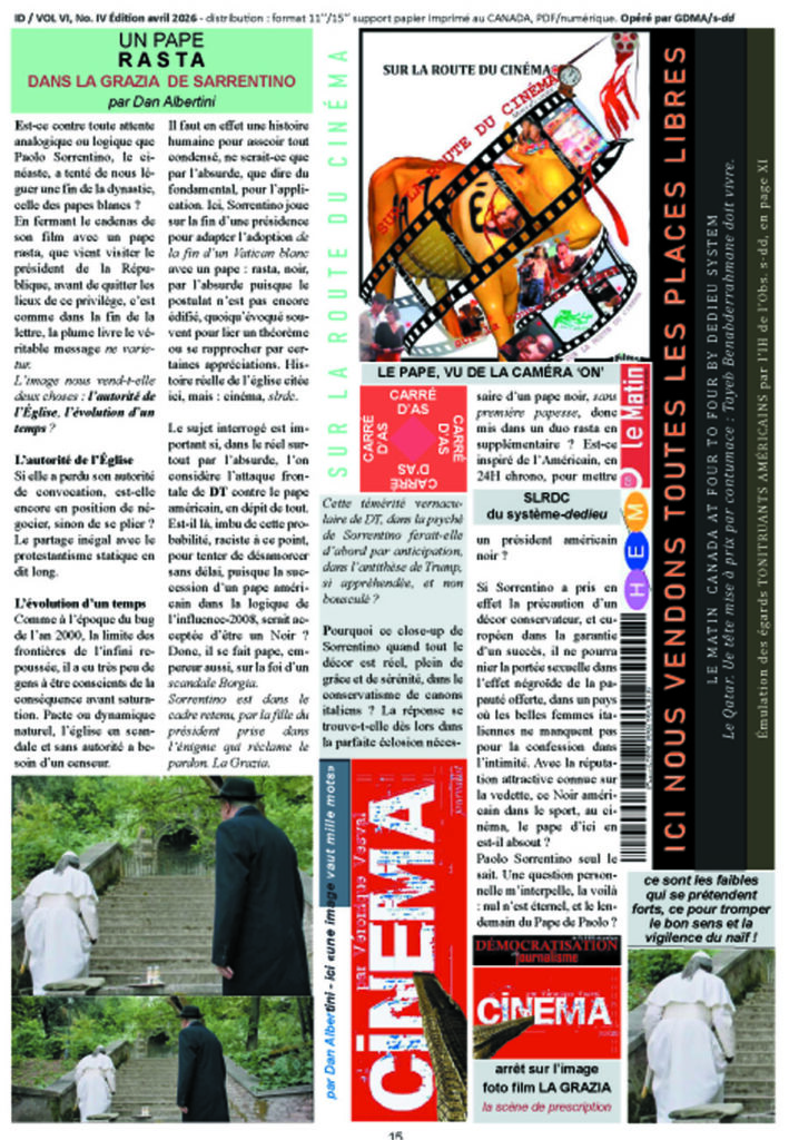 Si Sorrentino a pris en effet la précaution d’un décor conservateur, et européen dans la garantie d’un succès, il ne pourra nier la portée sexuelle dans l’effet négroïde de la papauté offerte, dans un pays où les belles femmes italiennes ne manquent pas pour la confession dans l’intimité. Avec la réputation attractive connue sur la vedette, ce Noir américain dans le sport, au cinéma, le pape d’ici en est-il absout ?