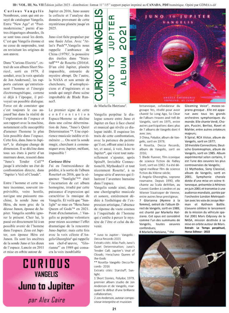 J’ai eu l’outrecuidance de prédire, à la sortie de l’album Rosetta4 en 2016, que la séquence “Sunlight”** était l’incarnation de cet album homogène, irradié par cette puissance d’expression qui caractérise la musique de Vangelis. Et voilà que “Sunlight” se mue en “Hera/Juno Queen of Gods”* en 2021. Point d’exclamation…! Vangelis se perpétue volontiers pour mieux accentuer l’effet dramatique de la rencontre Juno-Jupiter; mais cette fois avec la voix céleste d’Angela Gheorghiu6 qui rappelle son chef-d’œuvre, “Glorianna”7 en 1989 qui consacra la voix inoubliable de Markella Hatziano8.