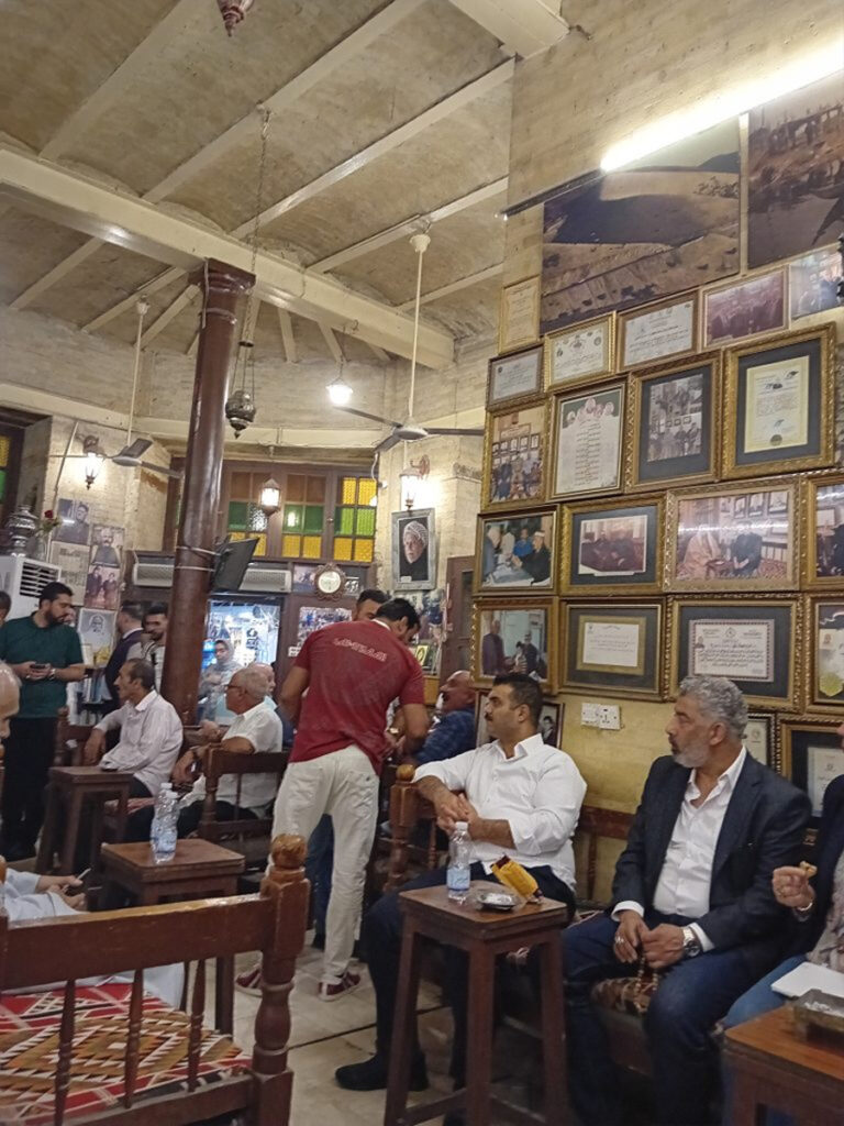 Inside this beautiful café, the leather and wood seating acts as a remembrance of the countless stories, conversations, and shared moments that have taken place. Tables with antique brass decanters and aged samovars, stand as keepers of a tradition that has endured the ages, and the walls adorned with portraits of Ottoman Pashas, King Faisal II, and Iraqi Poets are not just decorations but reminders of the past telling a story of the rich cultures that have come together within these walls.