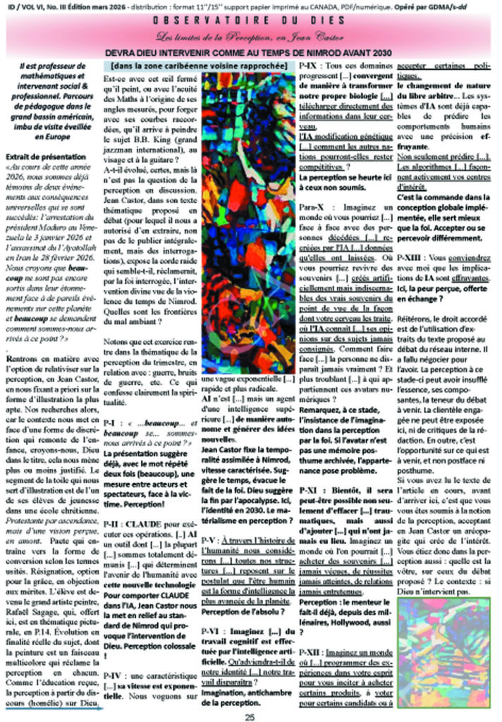 Si vous avez lu le texte de l’article en cours, avant d’arriver ici, c’est que vous vous êtes soumis à la notion de la perception, acceptant en Jean Castor un aréopagite qui crée de l’intérêt. Vous étiez donc dans la perception aussi : quelle est la vôtre, sur ceux du débat proposé ? Le contexte : si Dieu n’intervient pas.