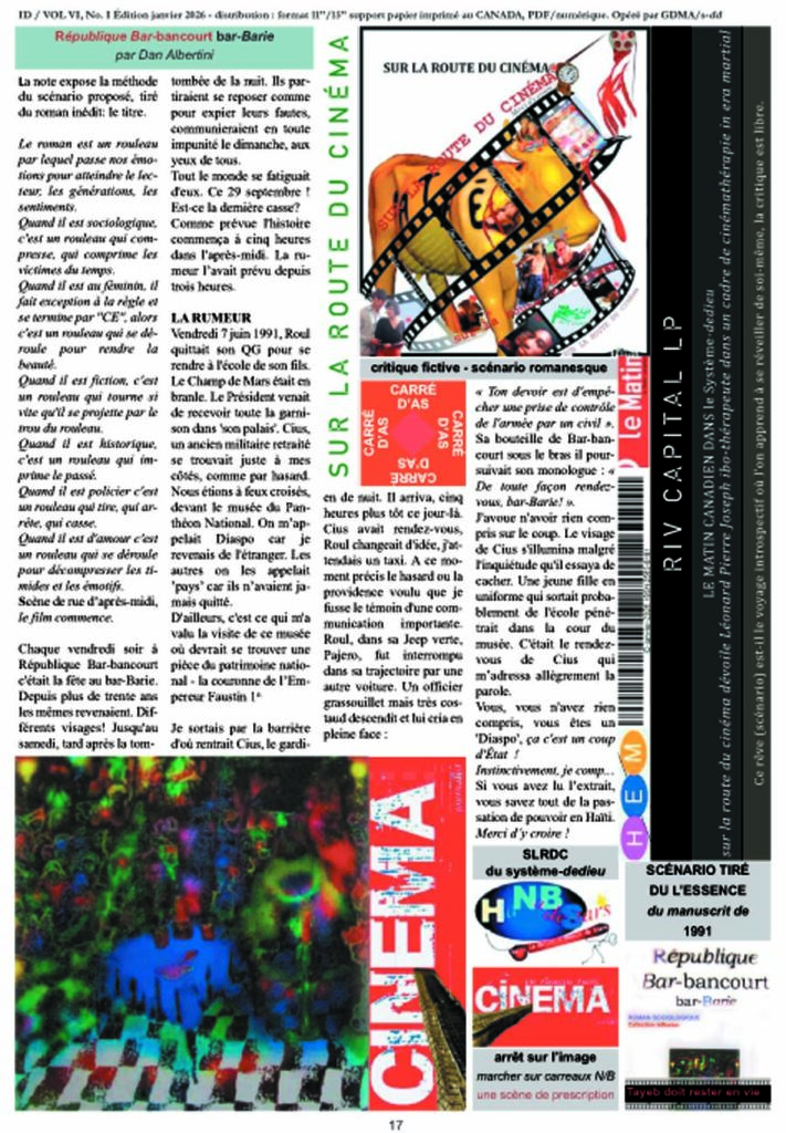 Je sortais par la barrière d’où rentrait Cius, le gardien de nuit. Il arriva, cinq heures plus tôt ce jour-là. Cius avait rendez-vous, Roul changeait d’idée, j’attendais un taxi. A ce moment précis le hasard ou la providence voulu que je fusse le témoin d’une communication importante. Roul, dans sa Jeep verte, Pajero, fut interrompu dans sa trajectoire par une autre voiture. Un officier grassouillet mais très costaud descendit et lui cria en pleine face : « Ton devoir est d’empêcher une prise de contrôle de l’armée par un civil ». Sa bouteille de Bar-bancourt sous le bras il poursuivait son monologue : « De toute façon rendez-vous, bar-Barie! ».