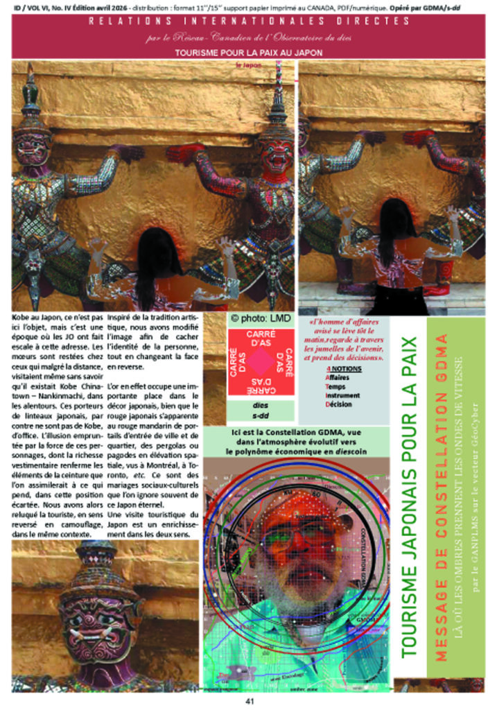 L’or en effet occupe une importante place dans le décor japonais, bien que le rouge japonais s’apparente au rouge mandarin de portails d’entrée de ville et de quartier, des pergolas ou pagodes en élévation spatiale, vus à Montréal, à Toronto, etc. Ce sont des mariages sociaux-culturels que l’on ignore souvent de ce Japon éternel.