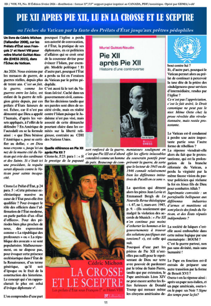 An 2026. Nous existons par les menaces de guerre, de guerres réelles, depuis plus de trente ans. C’est un fait, la guerre, comme les guerres entre les laïcs, est enfant de la guerre de religion gérée depuis, par ces prélats d’États faiseurs de roi. Échec, car il n’est pas démontré que Dieu a appelé l’humain, d’après les versets appliqués, à l’effet de le défendre ? En Amérique de l’autodafé on se la formule ainsi : « que Dieu bénisse l’Amérique », pour se certifier au dollar, « en Dieu nous croyons », jusqu’ici au nez de la muette cité du Vatican qui crée des cardinaux et des Saints. Si c’était ici une procédure, la requête serait déposée contre le Vatican pour sainte incapacité.