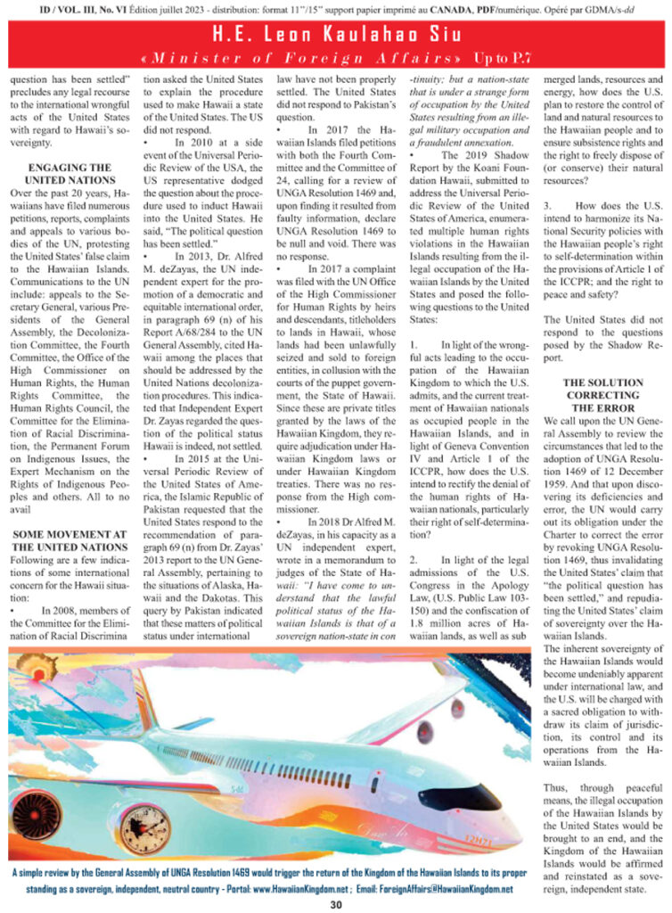 We call upon the UN General Assembly to review the circumstances that led to the adoption of UNGA Resolution 1469 of 12 December 1959. And that upon discovering its deficiencies and error, the UN would carry out its obligation under the Charter to correct the error by revoking UNGA Resolution 1469, thus invalidating the United States’ claim that “the political question has been settled,” and repudiating the United States’ claim of sovereignty over the Hawaiian Islands. The inherent sovereignty of the Hawaiian Islands would become undeniably apparent under international law, and the U.S. will be charged with a sacred obligation to withdraw its claim of jurisdiction, its control and its operations from the Hawaiian Islands.