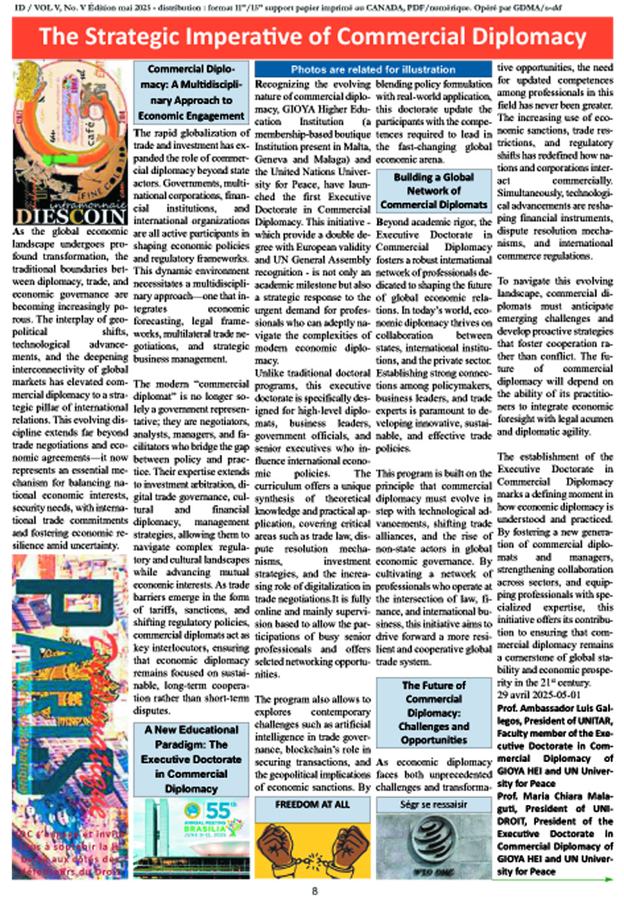 Recognizing the evolving nature of commercial diplomacy, GIOYA Higher Education Institution (a membership-based boutique Institution present in Malta, Geneva and Malaga) and the United Nations University for Peace, have launched the first Executive Doctorate in Commercial Diplomacy. This initiative – which provide a double degree with European validity and UN General Assembly recognition – is not only an academic milestone but also a strategic response to the urgent demand for professionals who can adeptly navigate the complexities of modern economic diplomacy.