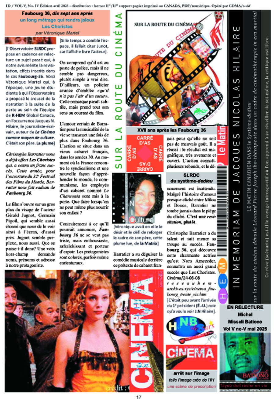 [l’Observatoire SLRDC propose en cadence en relecture un sujet passé qui, à notre avis mérite la revisitation, effets inscrits dans le cas Faubourg-36. Voici Véronique Martel qui, à l’époque, une jeune étudiante à qui l’Observatoire a proposé le creuset de la narration à la suite de la perte au sein de l’équipe de R-HEM Global Canada, en l’occurrence Jacques N. Hilaire, le journaliste-écrivain, auteur de Le Cinéma comme moyen de culture. C’était son père. La plume]