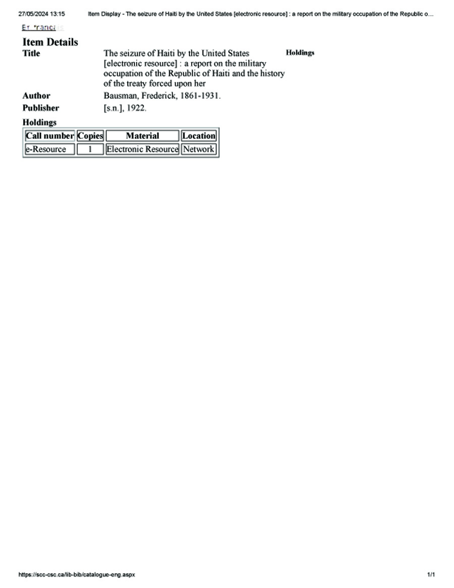 Supreme Court of Canada – Library Catalogue F Bausman Haiti Published May 27, 2024 at 900 × 1165 in In culpa peregrini (par la faute de l’étranger) Lire en ‘The Seizure of Haiti by the United Stat ← Previous Library Supreme Court Canada