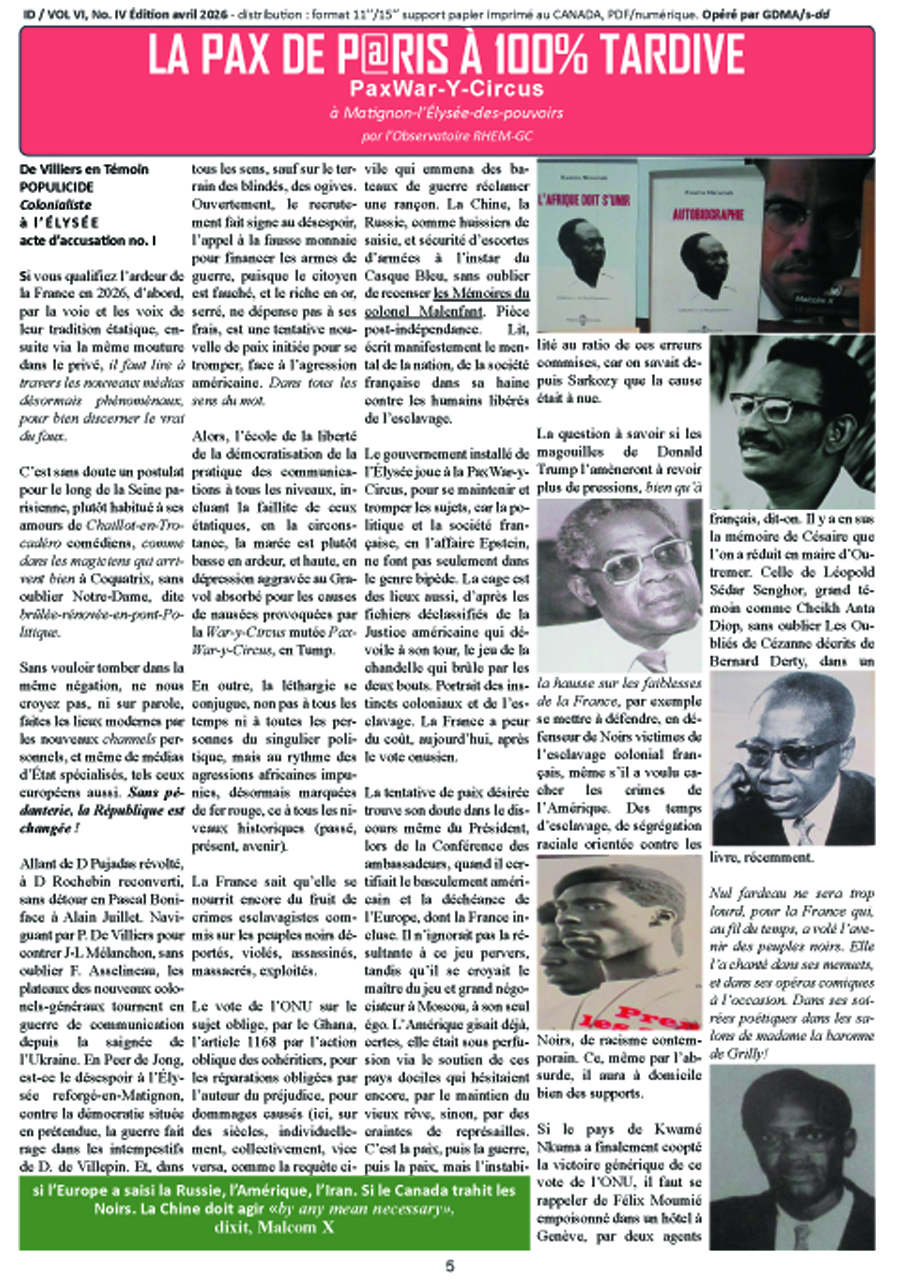 La question à savoir si les magouilles de Donald Trump l’amèneront à revoir plus de pressions, bien qu’à la hausse sur les faiblesses de la France, par exemple se mettre à défendre, en défenseur de Noirs victimes de l’esclavage colonial français, même s’il a voulu cacher les crimes de l’Amérique. Des temps d’esclavage, de ségrégation raciale orientée contre les Noirs, de racisme contemporain. Ce, même par l’absurde, il aura à domicile bien des supports.