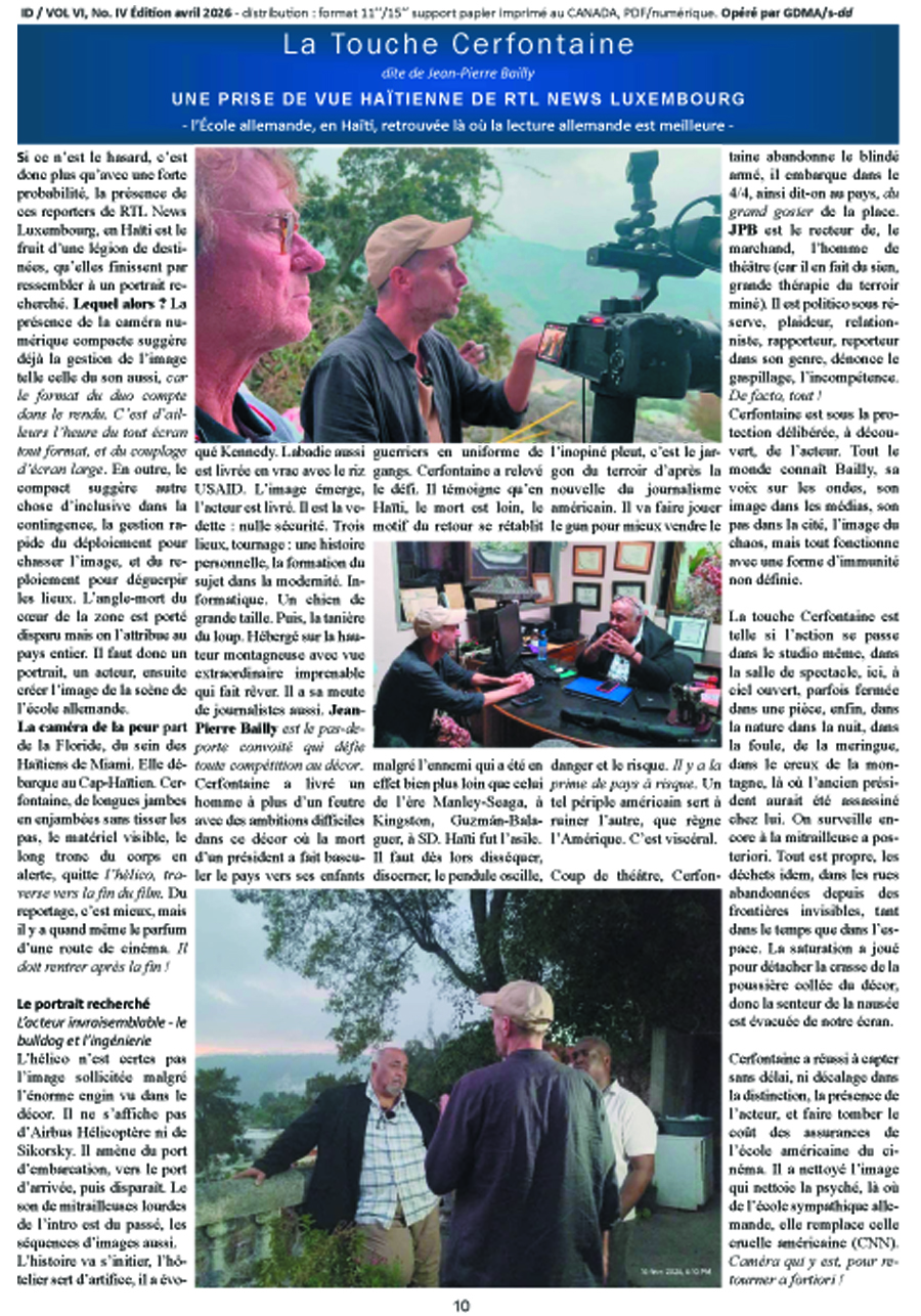 Si ce n’est le hasard, c’est donc plus qu’avec une forte probabilité, la présence de ces reporters de RTL News Luxembourg, en Haïti est le fruit d’une légion de destinées, qu’elles finissent par ressembler à un portrait recherché. Lequel alors ? La présence de la caméra numérique compacte suggère déjà la gestion de l’image telle celle du son aussi, car le format du duo compte dans le rendu. C’est d’ailleurs l’heure du tout écran tout format, et du couplage d’écran large. En outre, le compact suggère autre chose d’inclusive dans la contingence, la gestion rapide du déploiement pour chasser l’image, et du reploiement pour déguerpir les lieux. L’angle-mort du cœur de la zone est porté disparu mais on l’attribue au pays entier. Il faut donc un portrait, un acteur, ensuite créer l’image de la scène de l’école allemande.