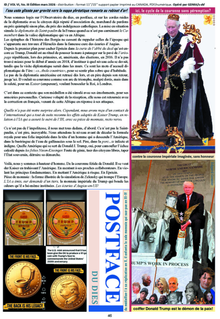 Pièce de monnaie : la forme illustrée de la simulation de Zelensky qui trompe l’Europe. L’IA a émis, sur demande d’un tiers, la monnaie impériale du Trump qui boude les odeurs qu’il a lui-même instituées. Les écuries d’Augias-en-US !