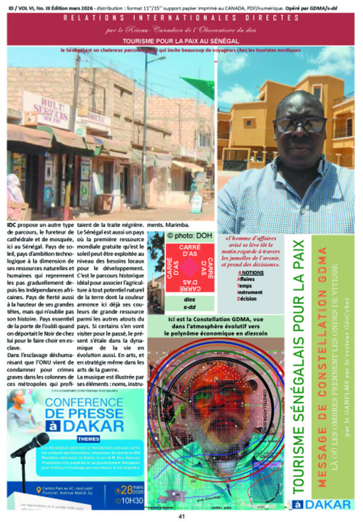 ans l’esclavage déshumanisant que l’ONU vient de condamner pour crimes graves dans les colonnes de ces métropoles qui profitaient de la traite négrière. Le Sénégal est aussi un pays où la première ressource mondiale gratuite qu’est le soleil peut être exploitée au niveau des besoins locaux pour le développement. C’est le parcours historique idéal pour associer l’agriculture à tout potentiel naturel de la terre dont la couleur annonce ici déjà ses couleurs de grande ressource parmi les autres atouts du pays. Si certains s’en vont visiter pour le passé, le présent s’étale dans la dynamique de la vie en évolution aussi. En arts, et en stratégie même dans les arts de la guerre.