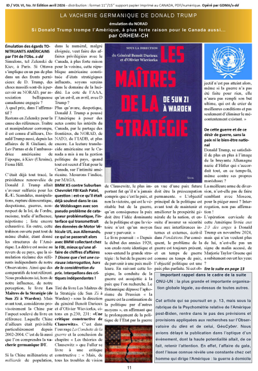 Cet article qui se poursuit en p. 13, mais sous la rubrique de la Psychométrie relative de l’Amérique post-Biden, rentre dans le pas des prévisions et provisions appliquées aux recherches sur l’Observatoire du dies et de celui, GéoCyber. Nous avions délayé la publication dans l’optique d’un événement, dont la haute potentialité allait, de ce fait, retenir l’attention. En effet, l’affaire du gala, dont l’issue connue révèle une constante chez cet homme qui dirige l’Amérique : la guerre à domicile. Suite…