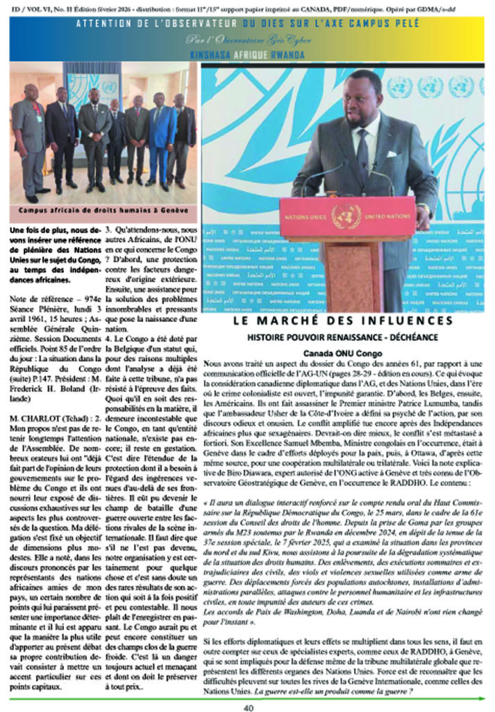 Nous avons traité un aspect du dossier du Congo des années 61, par rapport à une communication officielle de l’AG-UN (pages 28-29 – édition en cours). Ce qui évoque la considération canadienne diplomatique dans l’AG, et des Nations Unies, dans l’ère où le crime colonialiste est ouvert, l’impunité garantie. D’abord, les Belges, ensuite, les Américains. Ils ont fait assassiner le Premier ministre Patrice Lumumba, tandis que l’ambassadeur Usher de la Côte-d’Ivoire a défini sa psyché de l’action, par son discours odieux et onusien. Le conflit amplifié tue encore après des Indépendances africaines plus que sexagénaires. Devrait-on dire mieux, le conflit s’est métastasé a fortiori. Son Excellence Samuel Mbemba, Ministre congolais en l’occurrence, était à Genève dans le cadre d’efforts déployés pour la paix, puis, à Ottawa, d’après cette même source, pour une coopération multilatérale ou trilatérale. Voici la note explicative de Biro Diawara, expert autorisé de l’ONG active à Genève et très connu de l’Observatoire Géostratégique de Genève, en l’occurrence le RADDHO, dont le contenu :