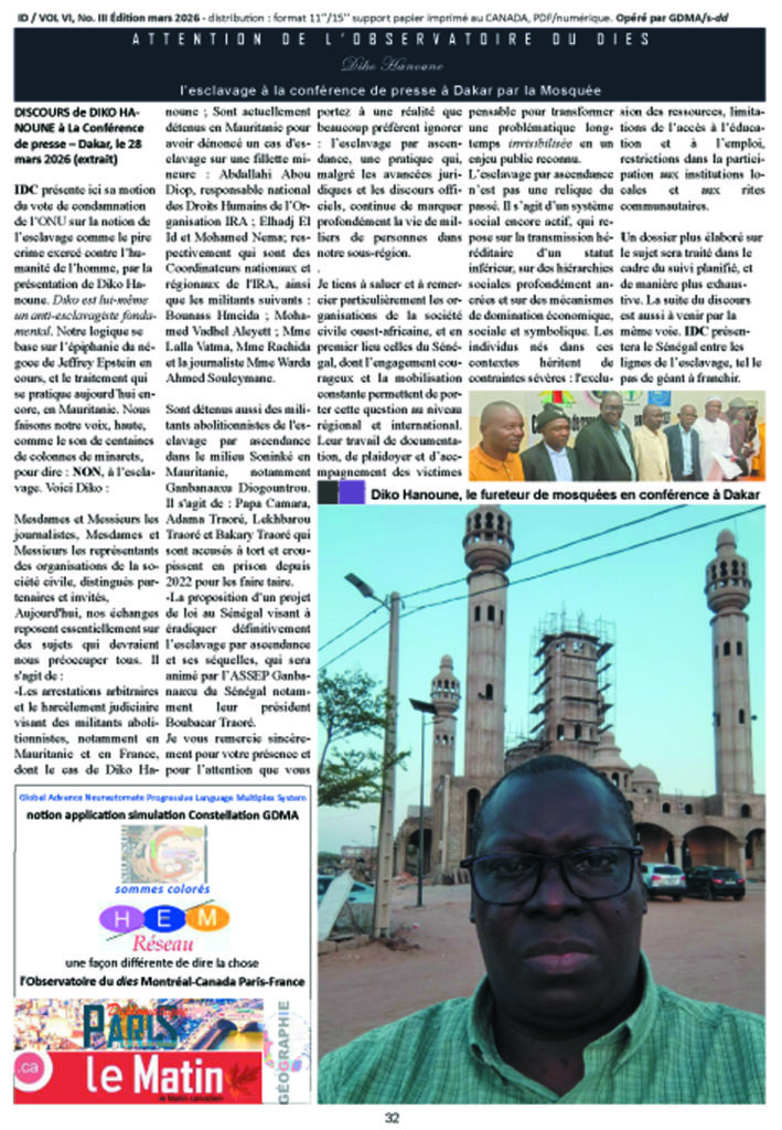 IDC présente ici sa motion du vote de condamnation de l’ONU sur la notion de l’esclavage comme le pire crime exercé contre l’humanité de l’homme, par la présentation de Diko Hanoune. Diko est lui-même un anti-esclavagiste fondamental. Notre logique se base sur l’épiphanie du négoce de Jeffrey Epstein en cours, et le traitement qui se pratique aujourd’hui encore, en Mauritanie. Nous faisons notre voix, haute, comme le son de centaines de colonnes de minarets, pour dire : NON, à l’esclavage. Voici Diko :