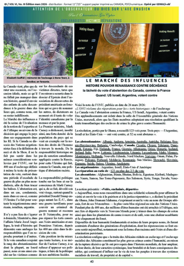 Le Marché des influences a été la scène de l’évaluation de la notion de l’expertise et de l’éthique au niveau de la décision qui engage le pays dans ses engagements dans les RI. Si le Canada se dissocie des Nations négationnistes face à la définition du nazi et de la Shoa, il ne le fait pas sentir dans les mêmes considérations soulevées par l’ONU, sur les 400 ans d’esclavage définis à même le texte de présentation du vote, surtout dans une période d’escalade de guerre de plus en plus mondialisée, afin de bien tracer les balises. L’abstention est, dans un cas, condamnée, mais dans ce cas-ci, comme l’Ukraine l’a fait pour soutenir le négationnisme américain, israélien, argentin.