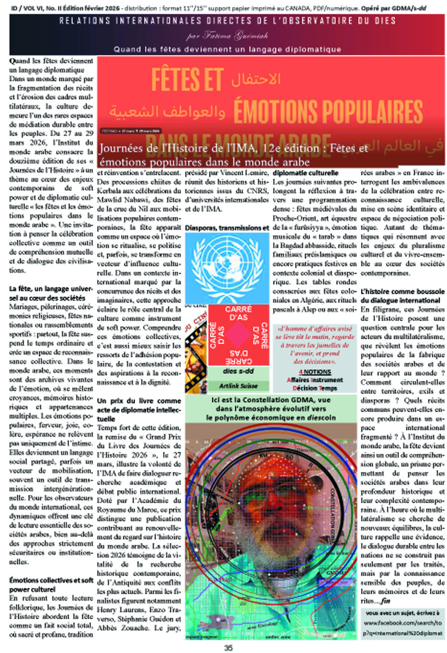 En filigrane, ces Journées de l’Histoire posent une question centrale pour les acteurs du multilatéralisme, que révèlent les émotions populaires de la fabrique des sociétés arabes et de leur rapport au monde ? Comment circulent-elles entre territoires, exils et diasporas ? Quels récits communs peuvent-elles encore produire dans un espace international fragmenté ? À l’Institut du monde arabe, la fête devient ainsi un outil de compréhension globale, un prisme permettant de penser les sociétés arabes dans leur profondeur historique et leur complexité contemporaine. À l’heure où le multilatéralisme se cherche de nouveaux équilibres, la culture rappelle une évidence, le dialogue durable entre les nations ne se construit pas seulement par les traités, mais par la connaissance sensible des peuples, de leurs mémoires et de leurs rites.