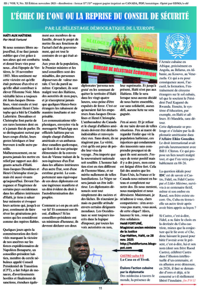 Comment a-t-on pu en arriver là? Et comment ont-ils osé, d’ailleurs? Si les conseillers-présidents ont un minimum d’honneur, ils devront déclarer ces deux diplomates ‘persona non grata’ en les sommant de quitter le territoire d’Haïti dans les vingt-quatre heures, sous peine d’être expulsés de force. C’est ce qu’auraient fait les empereurs Jean-Jacques Dessalines et Henri Christophe. L’ambassadeur du Canada et le chargé d’affaires américain doivent être déclarés indésirables et renvoyés chez eux. Sans doute, ils ne réagiront pas. La vérité, c’est qu’ils ont peur de perdre leur visa de voyage…Peu importe que la souveraineté nationale soit souillée. L’homme haïtien n’est en rien différent de l’homme blanc, et ne mérite nullement de telles humiliations. Le Nègre ne sera jamais un être inférieur. Les diplomates dénoncés sont tout simplement des racistes et des lâches. Ils n’auraient jamais eu pareille attitude envers certains dirigeants mondiaux. Les Occidentaux se sont toujours inscrits dans la logique d’imposer, par toutes les voix autorisées ou non, leur suprématie. Et jusqu’à présent, Haïti n’est pas aux Haïtiens. Elle le sera lorsque nous aurons décidé de nous battre ensemble, car sans solidarité, aucun défi, aucune lutte ne sera gagnée.