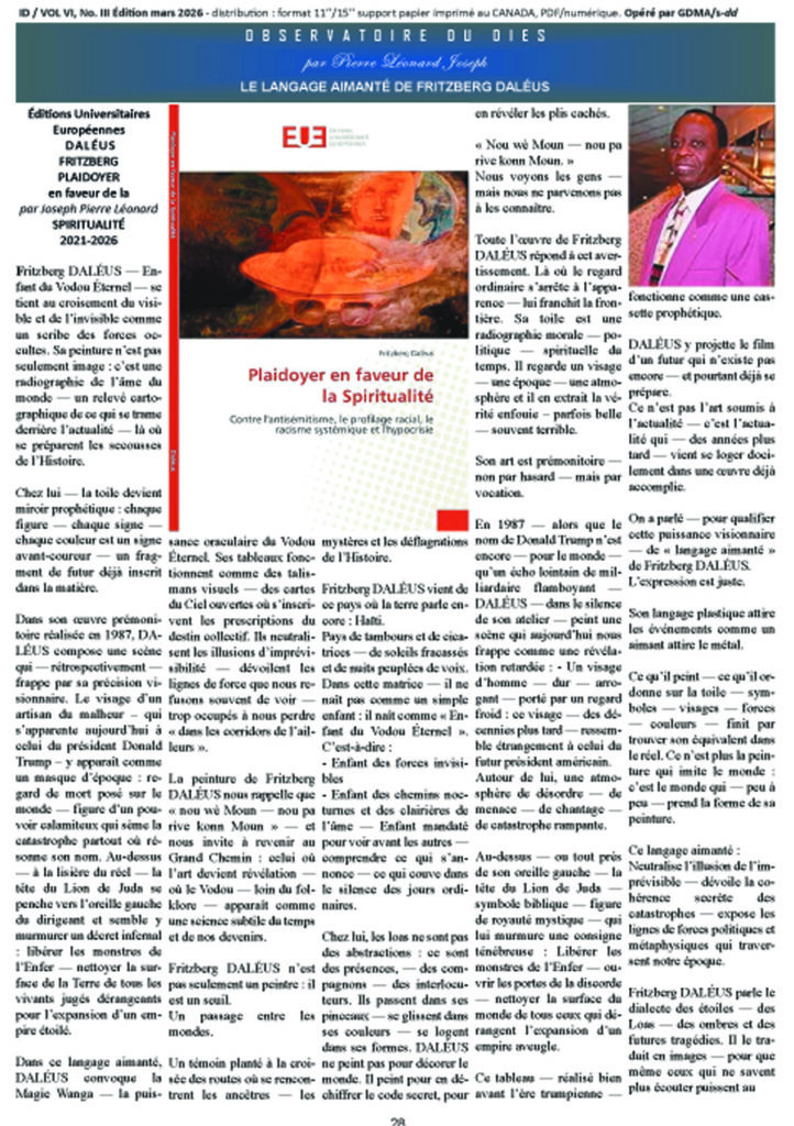 Fritzberg DALÉUS — Enfant du Vodou Éternel — se tient au croisement du visible et de l’invisible comme un scribe des forces occultes. Sa peinture n’est pas seulement image : c’est une radiographie de l’âme du monde — un relevé cartographique de ce qui se trame derrière l’actualité — là où se préparent les secousses de l’Histoire.