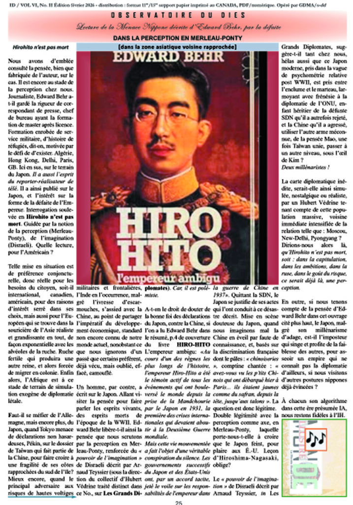Un homme, par contre, a écrit sur le Japon. Allant visiter la pensée pour faire parler les esprits vivants, des esprits morts de l’époque de la WWII. Edward Behr libère-t-il ainsi la pensée que nous scrutons par la perception en Merleau-Ponty, renforcée du « pouvoir de l’imagination » de Disraeli décrit par Arnaud Teyssier (sous la direction du collectif d’Hubert Védrine traité distinct dans ce No., sur Les Grands Diplomates). Car, il est polémiste.