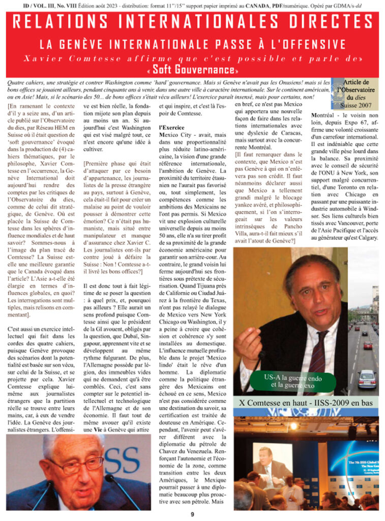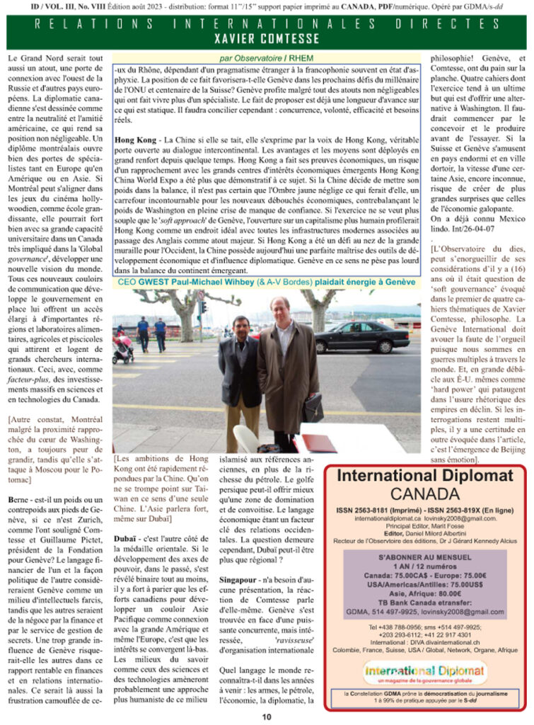 [En ramenant le contexte d’il y a seize ans, d’un article publié sur l’Observatoire du dies, par Réseau HEM en Suisse où il était question de ‘soft gouvernance’ évoqué dans la production de (4) cahiers thématiques, par le philosophe, Xavier Comtesse en l’occurrence, la Genève International doit aujourd’hui rendre des comptes par les critiques de l’Observatoire du dies, comme de celui dit stratégique, de Genève. Où est placée la Suisse de Comtesse dans les sphères d’influence mondiales et de haut savoir? Sommes-nous à l’image du plan tracé de Comtesse? La Suisse est-elle une meilleure garantie que le Canada évoqué dans l’article? L’Asie a-t-elle été élargie en termes d’influences globales, en quoi? Les interrogations sont multiples, mais relisons en commentant].